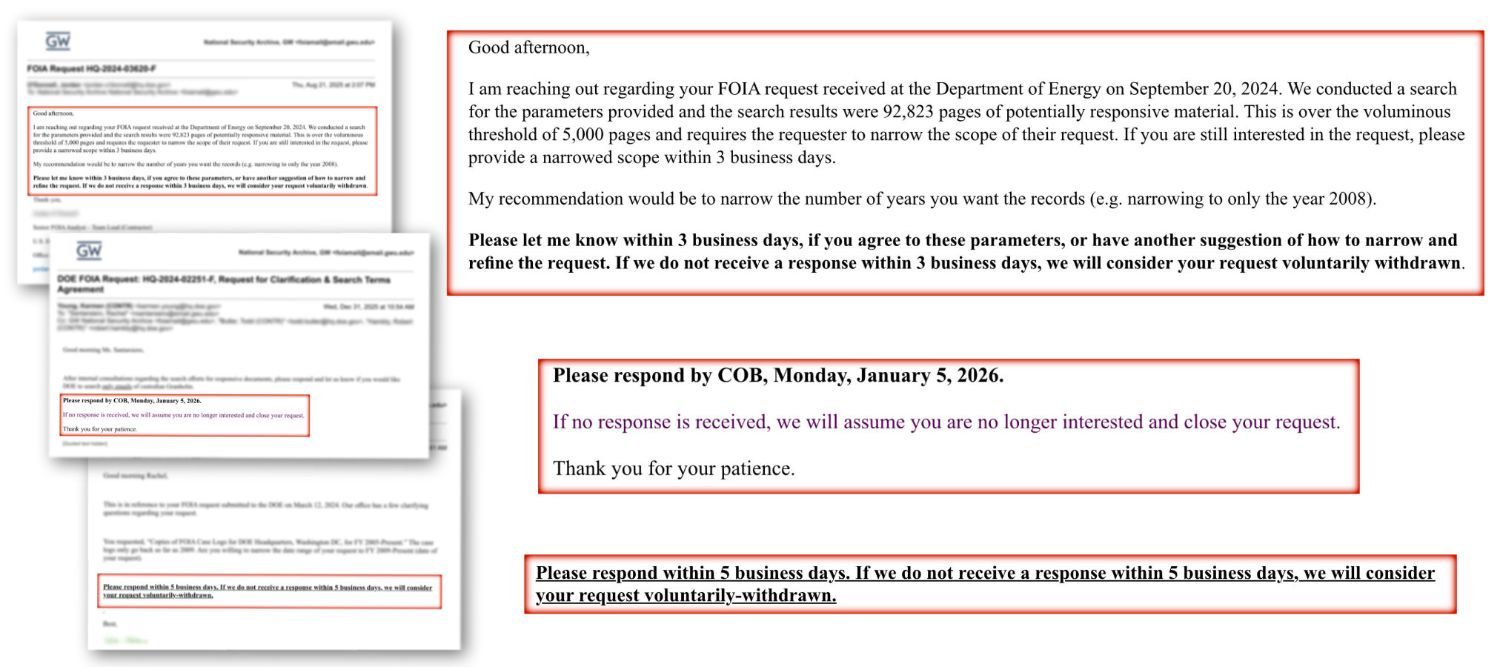 Washington, D.C., March 16, 2026 – In 2025, the Department of Energy gave the National Security Archive 3 business days to clarify a Freedom of Information Request that had generated nearly 100,000 pages of potentially responsive material, otherwise the request would be “voluntarily withdrawn.” On August 21, 2025, the DOE Office of the General Counsel wrote: “We conducted a search for the parameters provided and the search results were 92,823 pages of potentially responsive material. This is over the voluminous threshold of 5,000 pages and requires the requester to narrow the scope of their request. If you are still interested in the request, please provide a narrowed scope within three business days…If we do not receive a response within 3 business days, we will consider your request voluntarily withdrawn.” (emphasis added) Our request asked for copies of Department of Defense annual greenhouse gas inventory reports from 2009 to 2023 submitted to the Department of Energy’s Federal Energy Management Program. Sanitized summaries of DOD’s inventories can be found online, but the 92,823 responsive pages are integral to the public’s understanding of agency’s historically obscure emissions trends and their impacts on the planet’s warming climate. This important request is one of multiple instances in the last two years in which the Department of Energy has threatened to close access to information cases unless the Archive responded to a clarification request within 3 to 7 days. In none of these cases was the Archive notified of a right to appeal the agency’s determination. In 2025, two such demands from DOE came over federal holidays. The National Security Archive’s 2026 Sunshine Week Audit examines how federal agencies use “clarification of scope” letters to flip the burden of FOIA search and review onto requesters by punting their statutory responsibility. In total, we recorded 26 instances between 2024 and 2025 in which agencies used inconsistent parameters to clarify or narrow the scope of Archive FOIA requests. In 18 of those cases, agencies also threatened to administratively close the request if the deadline was not met. |